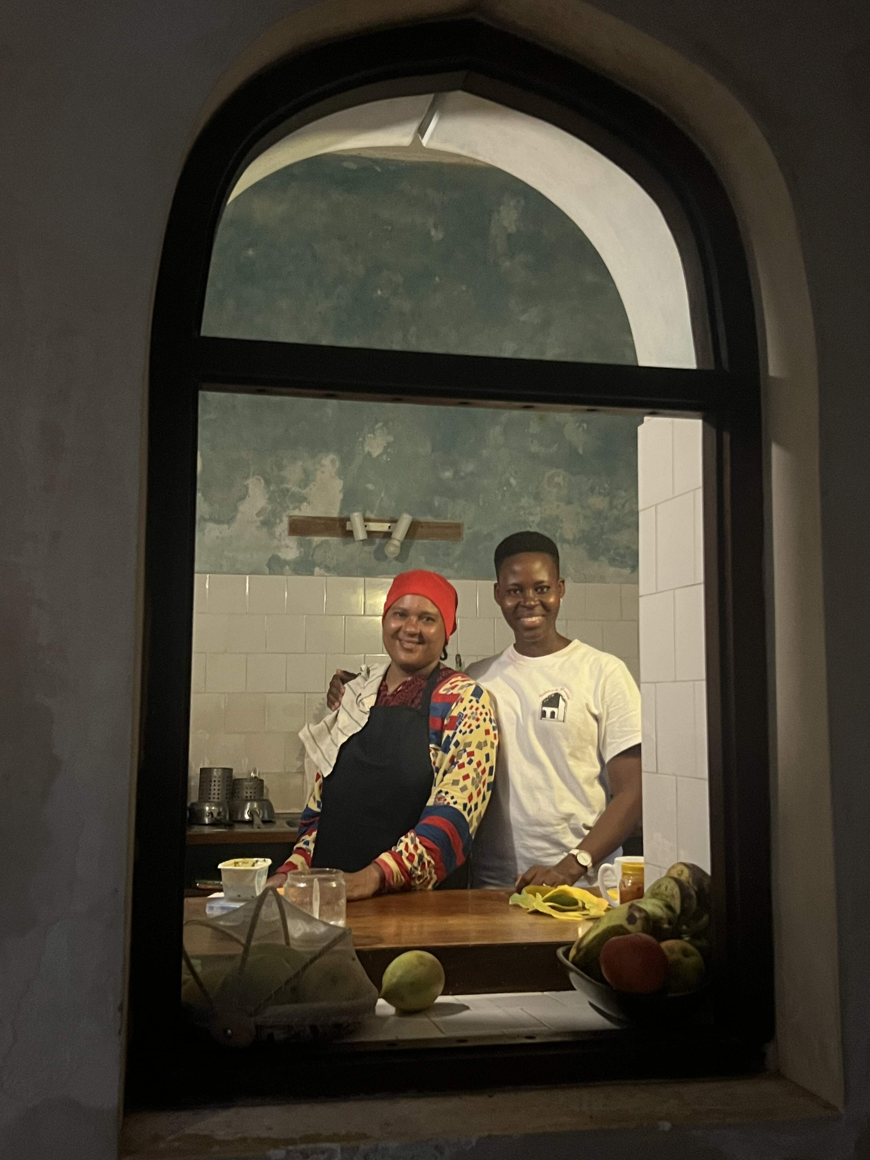 A couple of local cooks smile through the interior window of their kitchen restaurant in the old town of Lamu in Kenya's north coast.