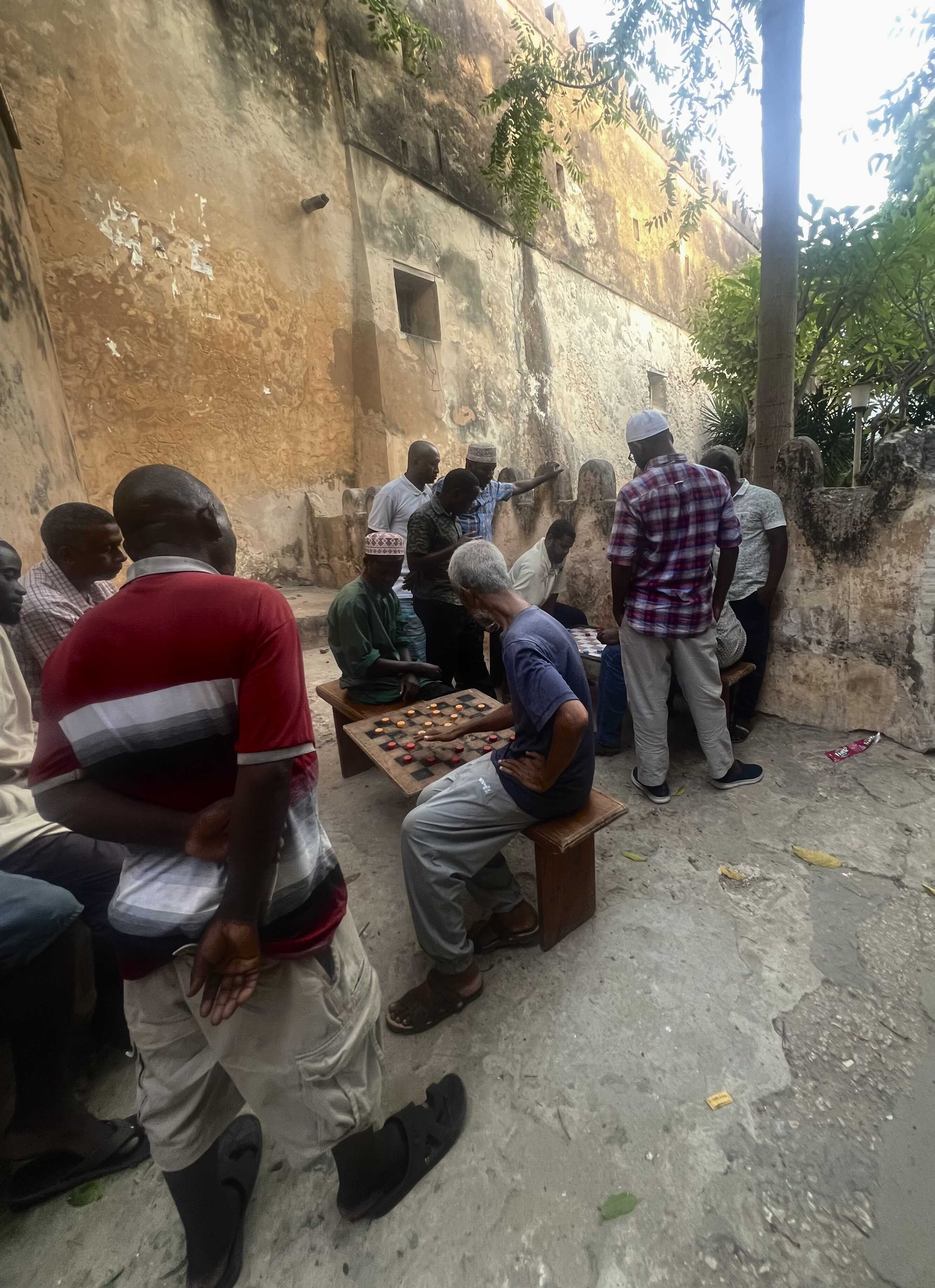 Outside the walls of the Lamu Fort, locals from all walks of life play games and relax in the late afternoon shade.